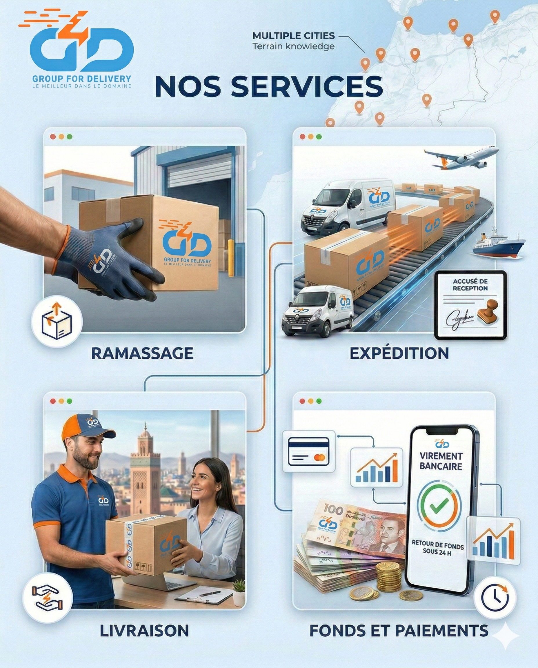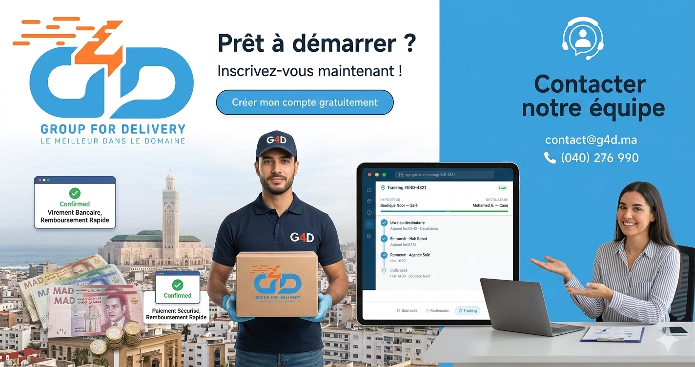 G4D (Group For Delivery) est un prestataire logistique marocain spécialisé dans l'accompagnement des TPE, PME et startups e-commerce. Notre expertise couvre l'intégralité de la chaîne logistique : de l'enlèvement de vos colis directement chez vous jusqu'à leur remise en mains propres au destinataire final, avec un suivi rigoureux à chaque étape.